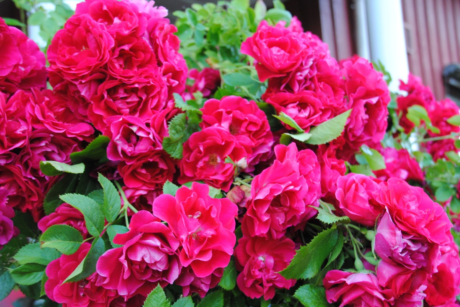 Apropos Mia Casa. Jeg har 4 klatreroser i hagen. Type Flammentanz. De sto her når vi kjøpte huset for 16 år siden. Rosene krever lite, men gir mye. Flammentanz er ei såkalt H6 rose - dvs på lune steder tåler den "alt". Grenene blir så overfylte og tunge av roser, at de kan knekke. Hvis man ikke er nøye med oppbindingen.